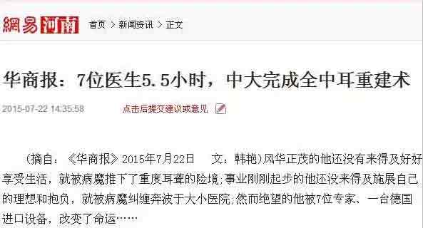 (摘自:华商报2015年7月22日 文:韩艳)风华正茂的他还没有来得及好好享受生活,就被病魔推下了重度耳聋的险境;事业刚刚起步的他还没来得及施展自己的理想和抱负,就被病魔纠缠奔波于大小医院;然而绝望的他被7位医生、一台进口设备,改变了命运……